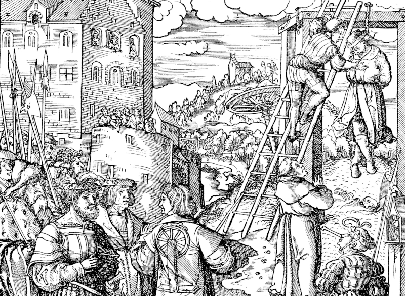 Holzschnitt um 1500, Hinrichtungsstätte mit Galgen und Rad, Theuerdank